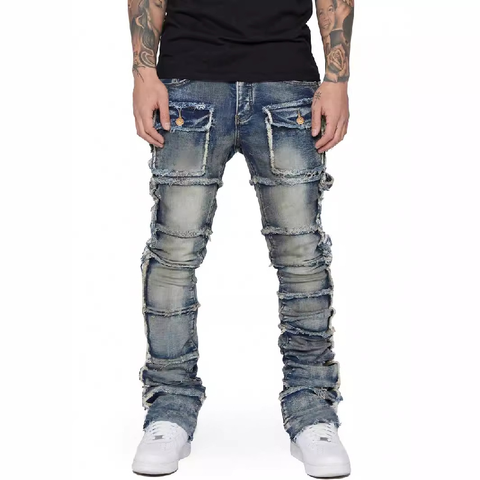 Pantalones rectos de carga informales para hombres europeos americanos otoño Ins caliente elástico Patchwork Denim con cintura media diseño acampanado en capas