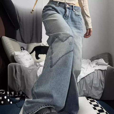 Pantalones vaqueros holgados con estampado Retro de pierna ancha de cintura baja de talla grande para mujer europea americana, suministro transfronterizo de comercio exterior