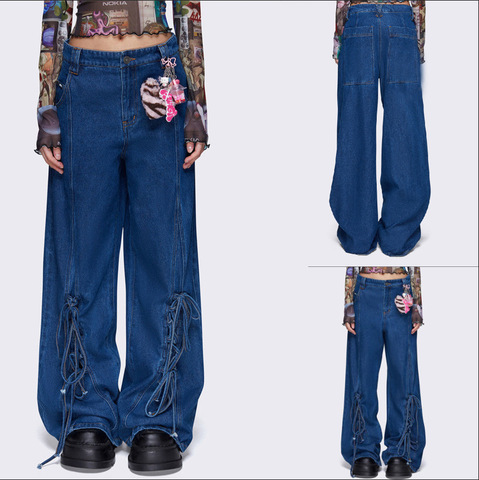 Nuevos pantalones Retro transfronterizos para mujer europea americana, pantalones vaqueros rectos de pierna ancha con corte de bota, decoración de corbata, cintura media, perezoso Suelto